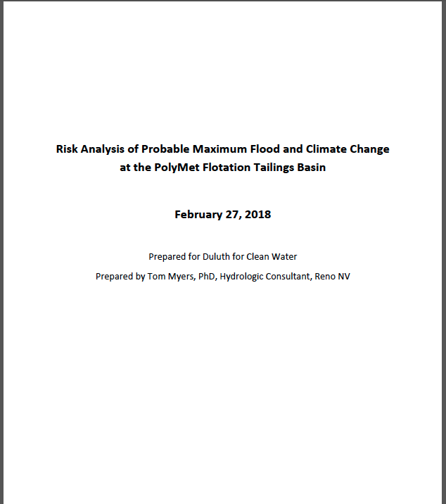 PolyMet's proposal does not address climate change in the design of the project’s tailings basin. Duluth for Clean Water commissioned a report by Dr. Tom Myers, an independent hydrogeologist in Reno, NV, to look into risks due to climate change. His report shows PolyMet used 20 year-old precipitation data when modeling the rainfall into the tailings basin, and neglected to include snowmelt. The report concludes that future rain events increase the risk of a catastrophic tailings dam failure upstream of Duluth and other communities along the St. Louis River.